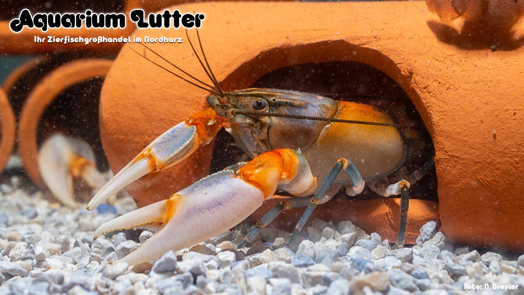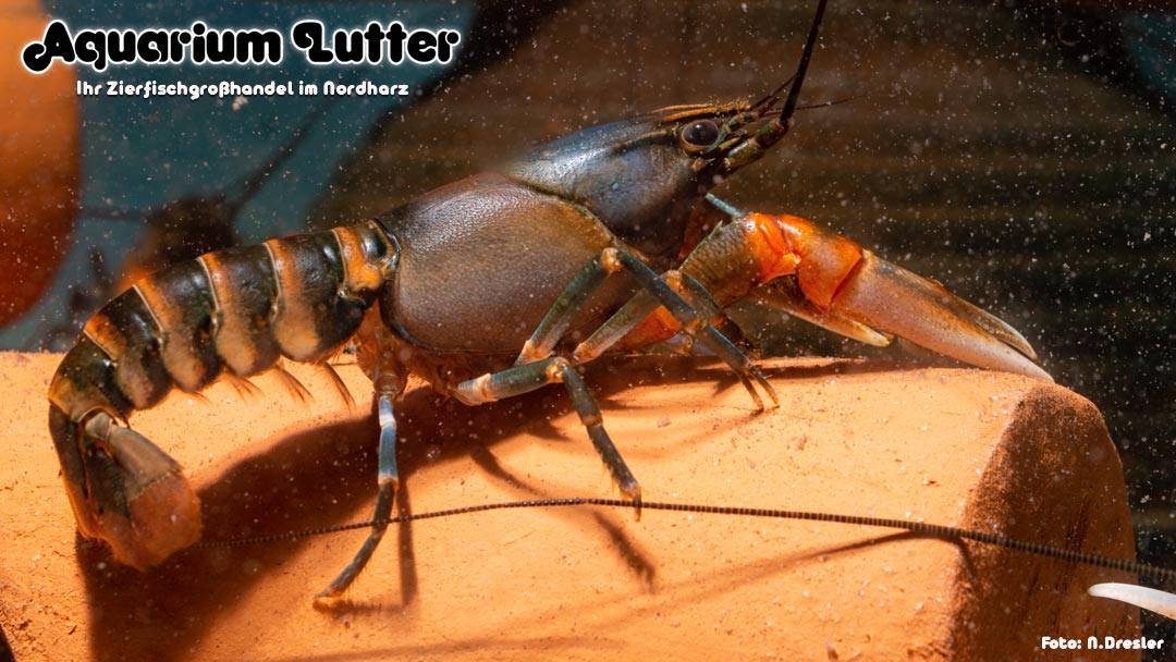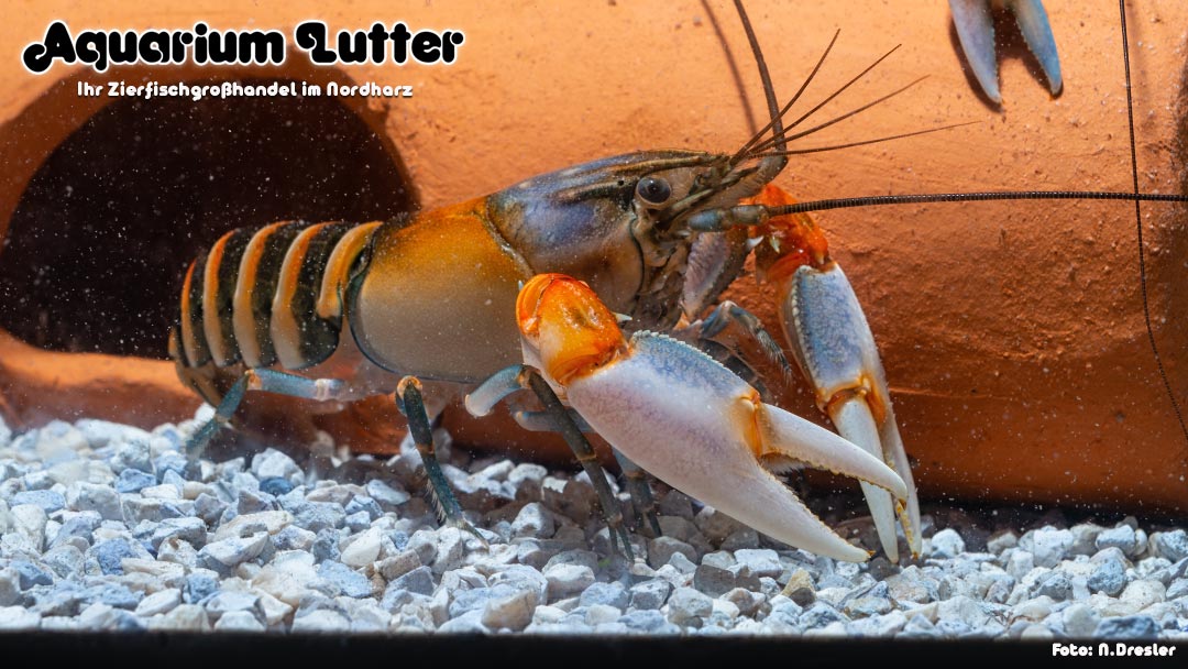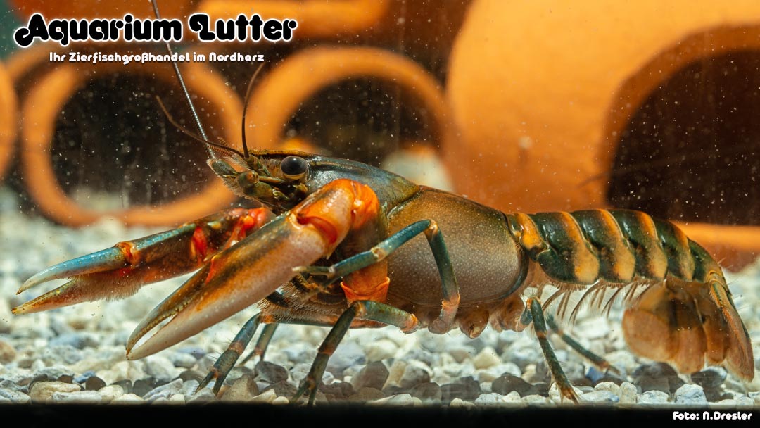 Der Zebra Flusskrebs (Cherax peknyi), stammt aus den klaren Flüssen und Bächen Neuguineas. Er gehört zu den dekorativsten Vertretern seiner Gattung, da sein Panzer mit einem auffälligen Zebramuster aus dunklen und hellen Streifen überzogen ist. Besonders die Scheren wirken durch die kontrastreiche Zeichnung sehr markant und machen ihn zu einem echten Blickfang im Aquarium. Mit einer Körperlänge von zwölf Zentimetern bleibt er mittelgroß und lässt sich auch in größeren Heimaquarien gut pflegen.